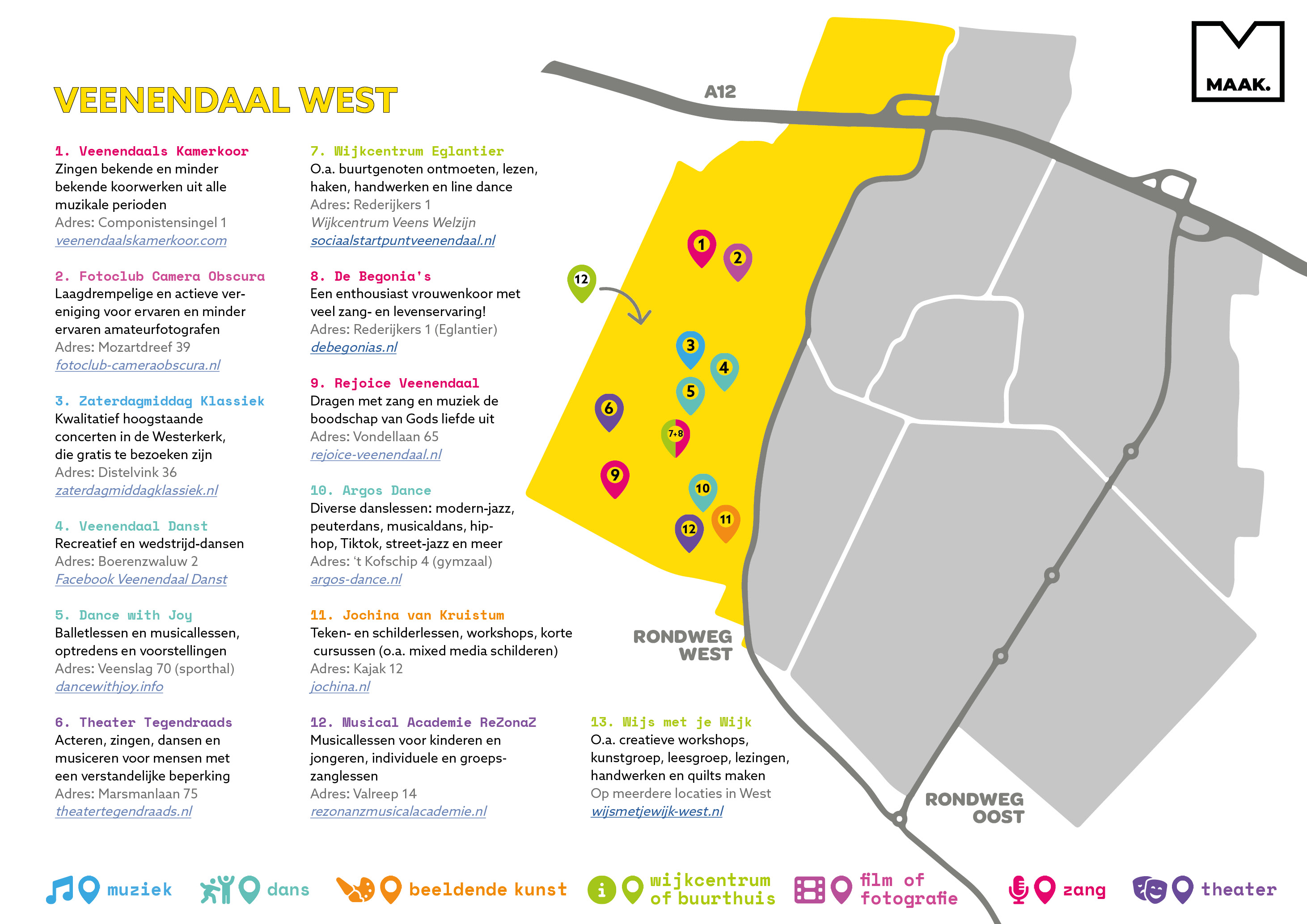 Wist je dat deze culturele clubs, verenigingen, plekken en kunstenaars in jouw wijk actief/aanwezig zijn? Wie weet heb je ergens al weleens meegedaan. Misschien mis je een culturele aanbieder op de kaart óf ben je er zelf één die we nog niet kennen. Laat het ons weten, dan voegen we deze zo snel mogelijk toe!